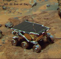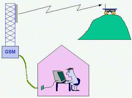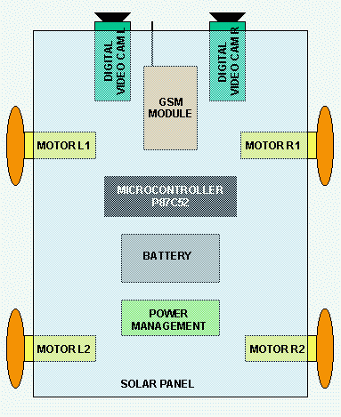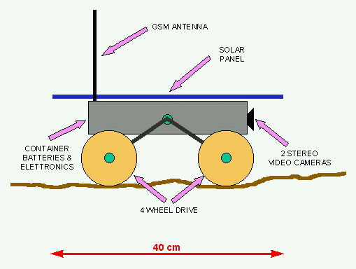 The robot would be used as follows: it is put in a remote location to be explored. The location should be covered by the GSM network and be an open space, so that solar panel can be exposed to the sun. The operator from the headquarter can link with the pathfinder through a PC connected via modem to the telephone netwotk. On the PC screen he can receive and visualise the images of the landscape seen by the Pathfinder. Since they are stereo images, he can evaluate distance and position of the objects that are shown, with respect to the robot. |