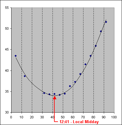 Where the curve is lowest, there is the local midday. For these data that were collected at the Beach Hut, one group calculated the local midday at 12:41 Unfortunately no measurements could be taken at the Boat yard, because