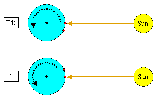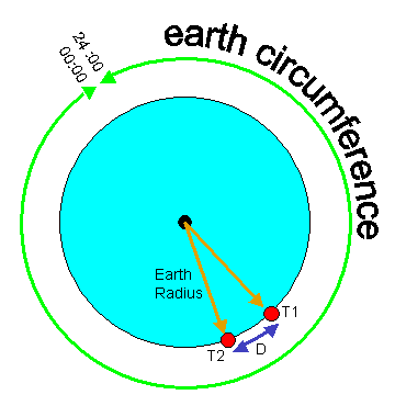 - calculate the time interval between these two events - calculate the ratio between the time that the earth takes to do a complete rotation (= 24 hours) and the above time interval - measure the distance between the two locations - calculate the earth circumference by multiplying this distance times the above ratio earth_circumference = D x 24_hours / (T2-T1) |